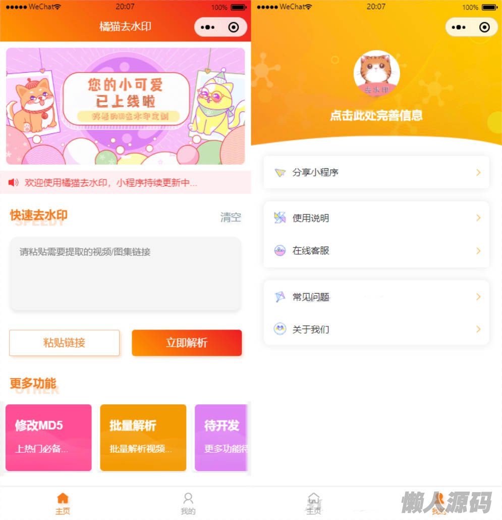 懒人源码 » 橘猫视频去水印微信小程序源码_自定义接口_PHP后端对接