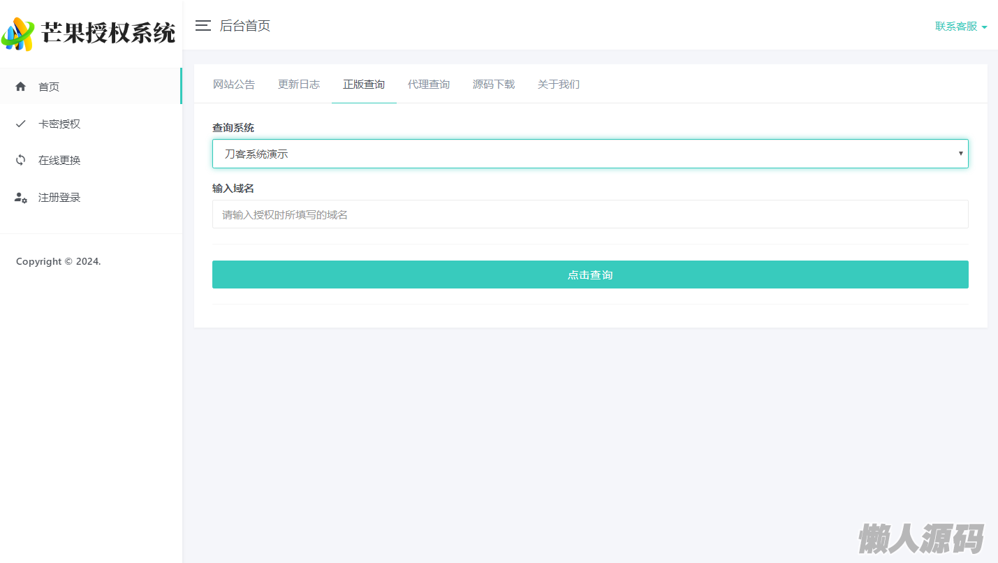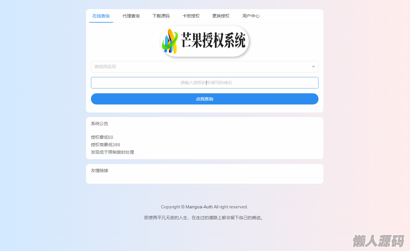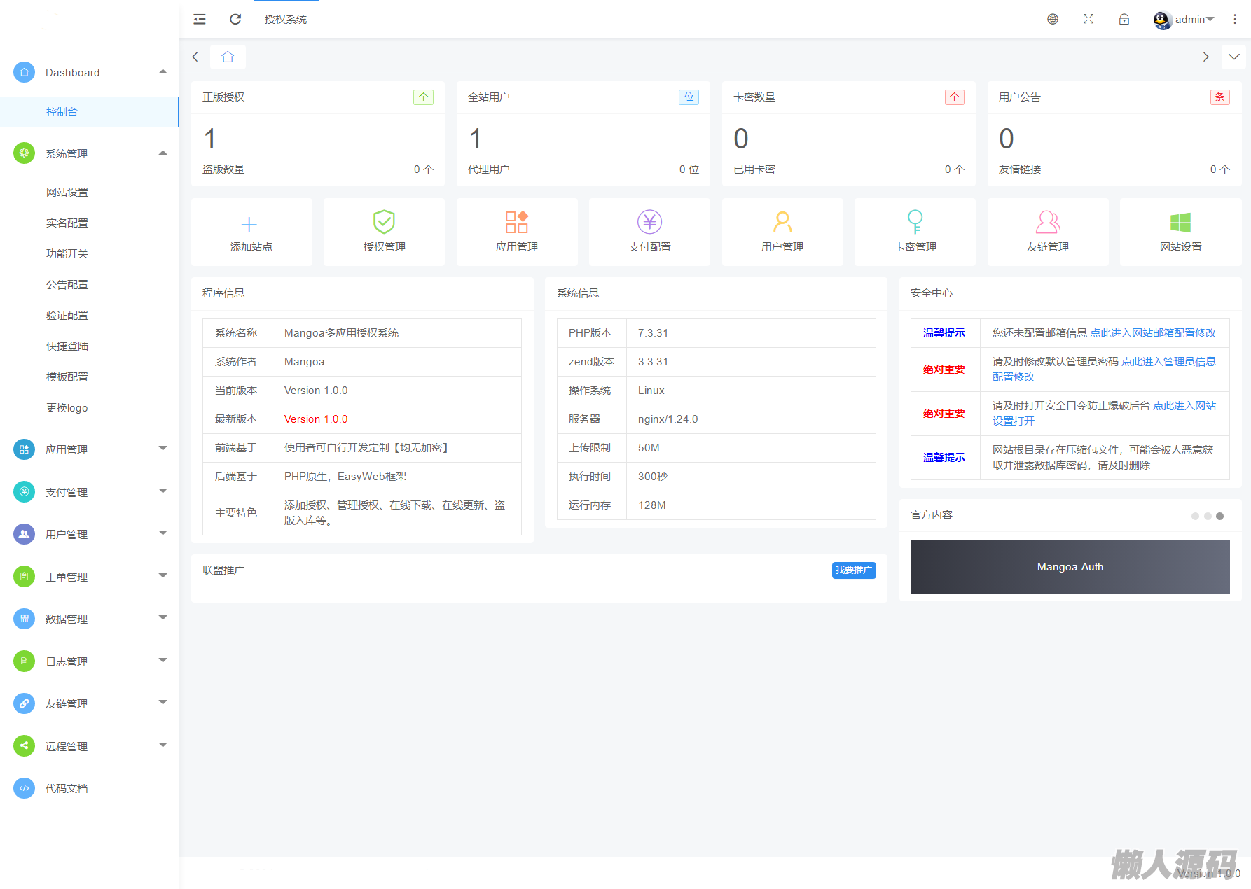 懒人源码 » Mangoa-Auth/芒果自助多应用企业级网站授权系统源码拥有盗版入库、远程更新等功能
