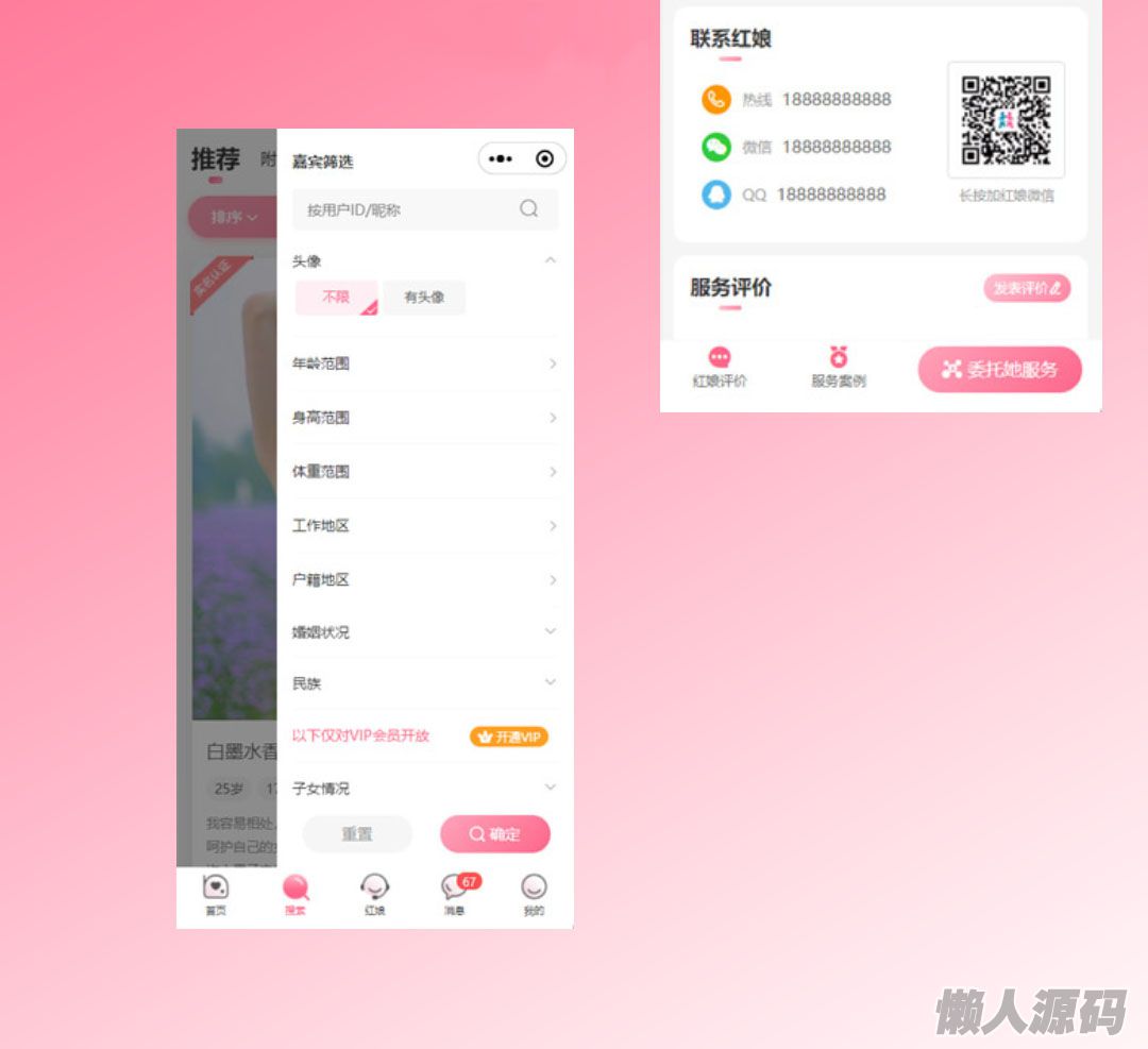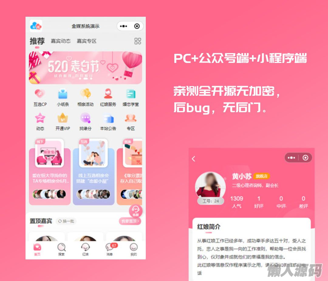 懒人源码 » 2024最新婚恋相亲系统源码 红娘金媒10.3 PC+小程序+公众号 接入三端