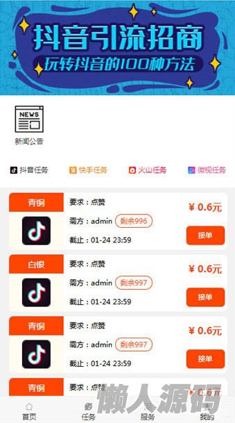懒人源码 » Thinkphp抖音快手点赞任务系统源码 修复美化版