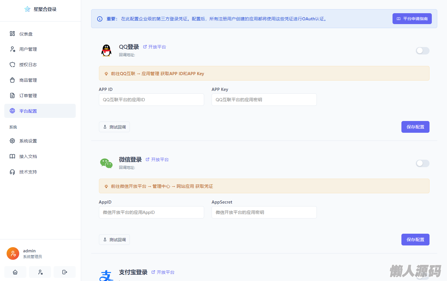 懒人源码 » 2026全新聚合登录系统源码 一栈式配置全部快捷登录接口