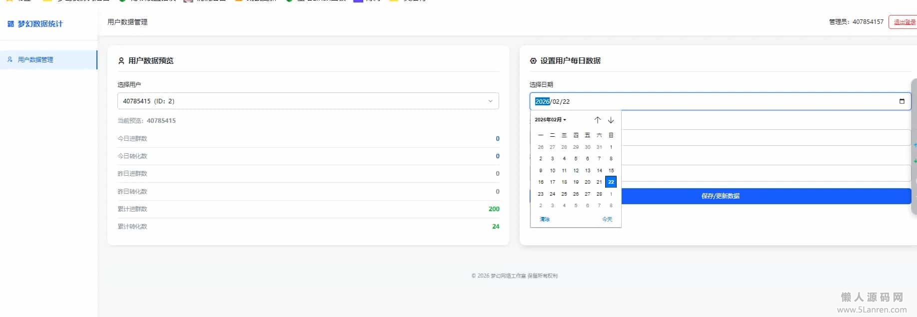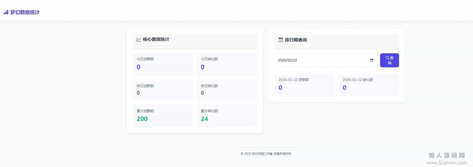 懒人源码网 » 【免费源码】梦幻数据统计1.0版本,拉新推广可以后台指定数据的