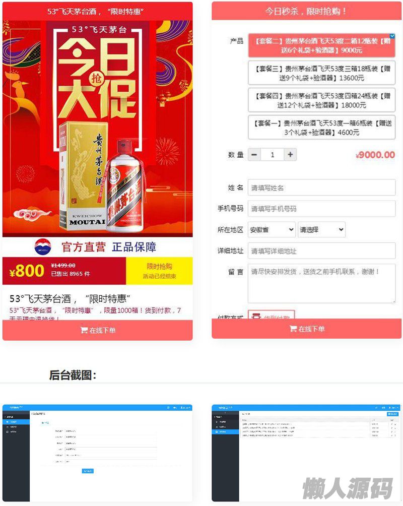 懒人源码 » PHP源码单页下单商城源码 茅台酒下单页+搭建教程