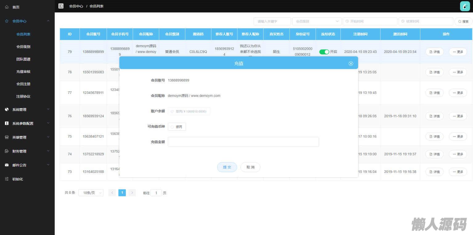 支持推广奖、团队奖会员等级奖励比例。可单独设置单个英雄。详细财务管理,交易明显一目了然。