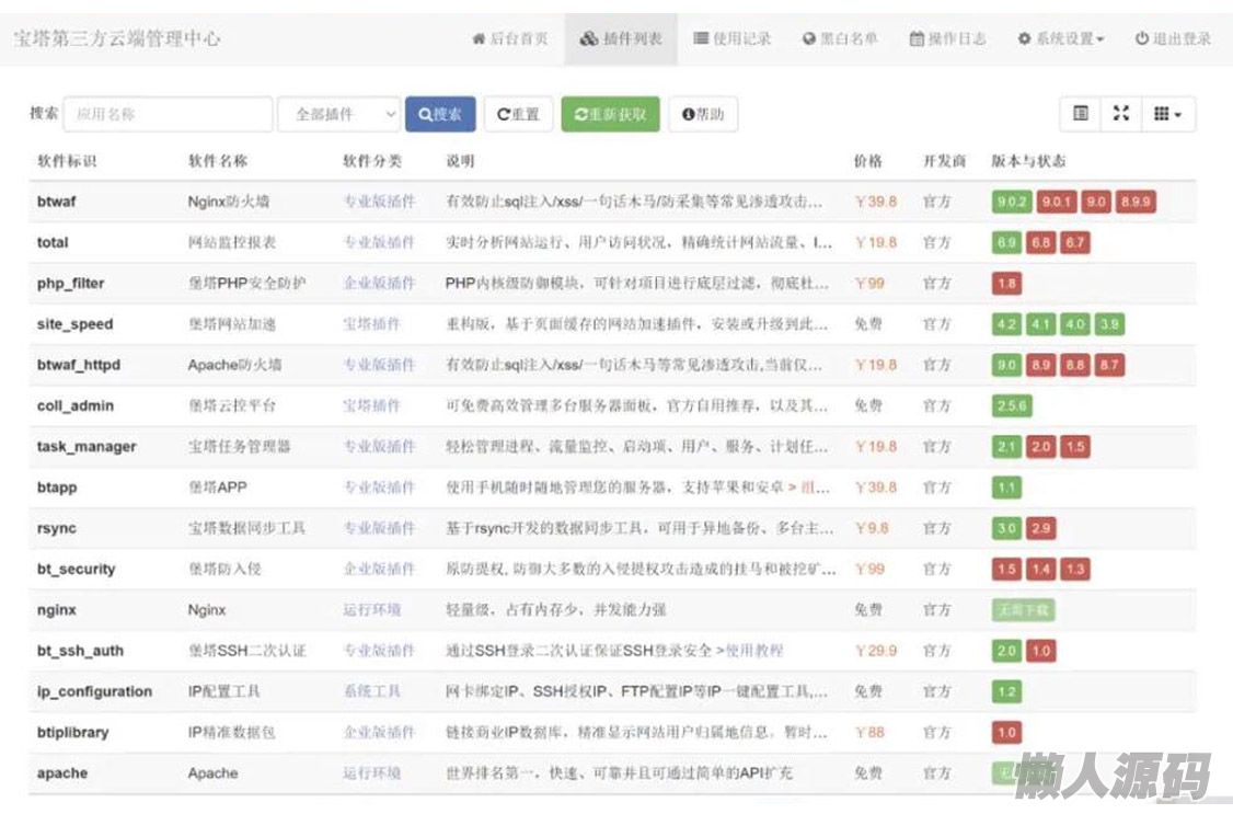 网站后台管理可一键同步宝塔的插件列表与增量更新插件包,还有云端使用记录、IP黑白名单、操作日志、定时任务等功能。