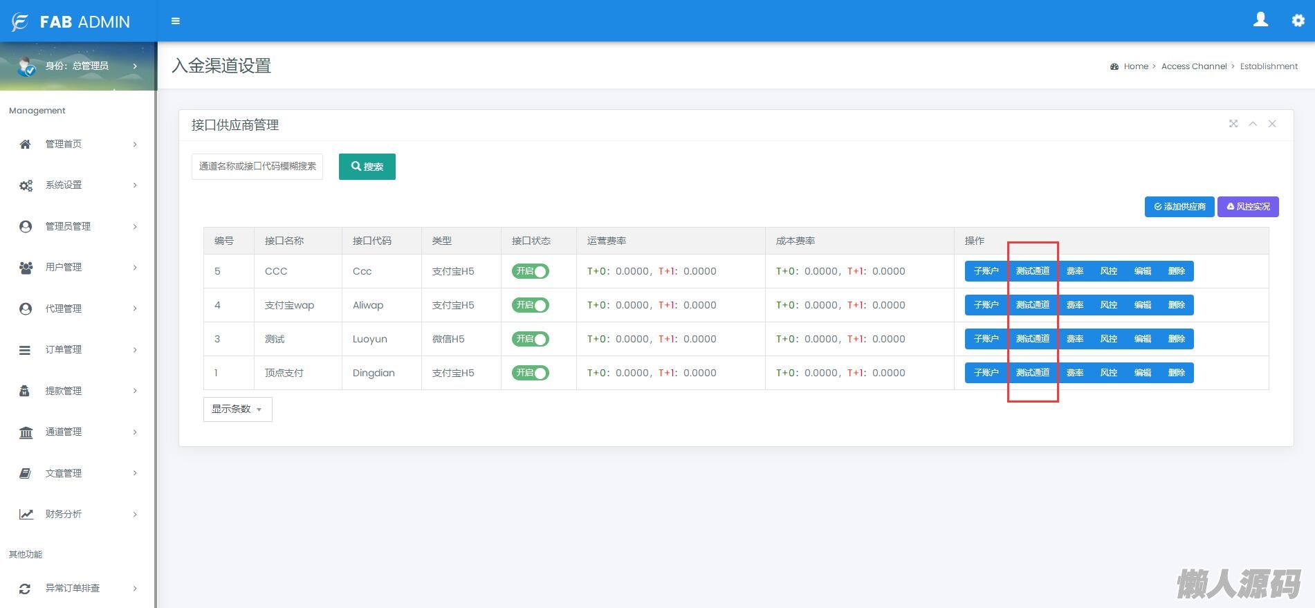 3、后台新增测试通道按钮,现在测试通道不需要使用商户链接去测试了,直接使用后台入金通道后面的测试通道按钮即可测试,方便快捷。
