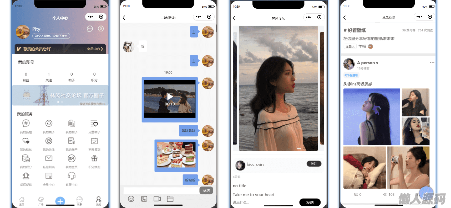 包括论坛图文帖,视频,圈子,IM私聊,支付,付费贴,积分签到,钱包等论坛小程序论坛app完整功能。