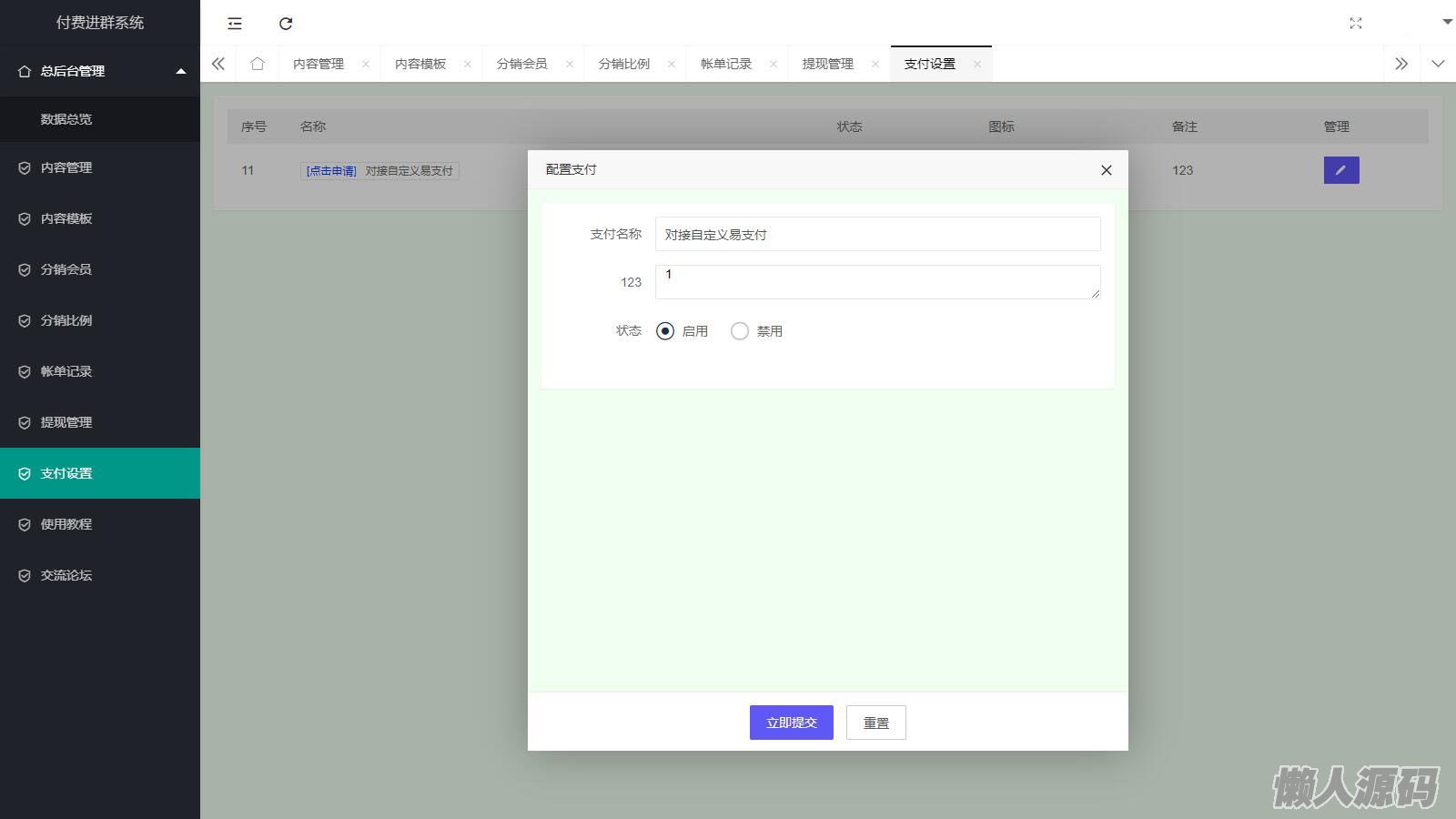 3. 支付对接第三方易支付,随便一家易支付平台都可以对接,进群码直接在后台上传就行,简单好操作