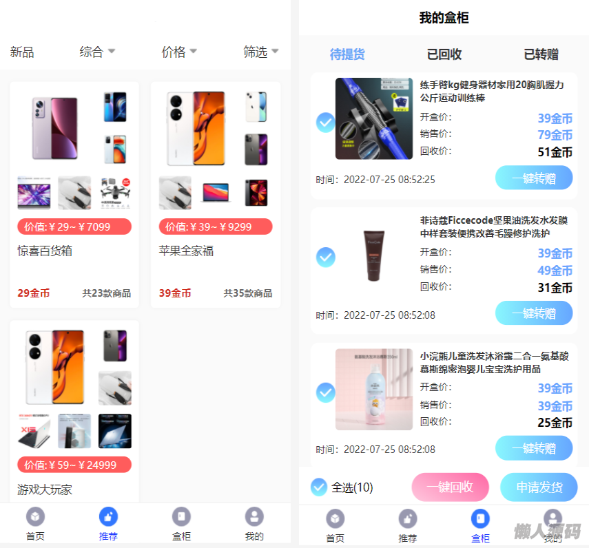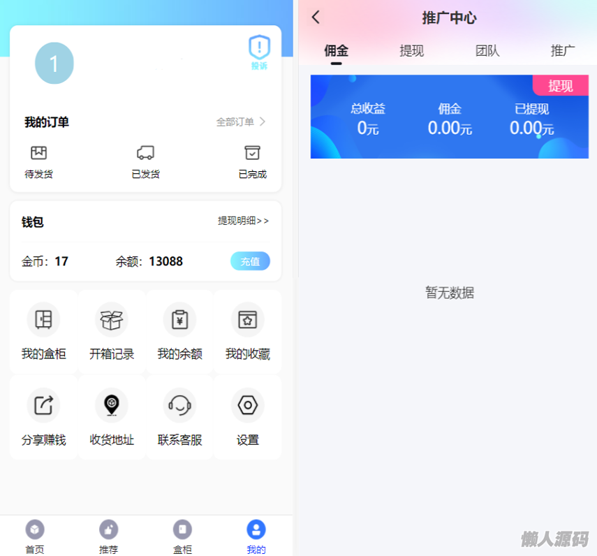 含3级分销,盲盒回收成余/额功能/晒图/盲盒转增功能。