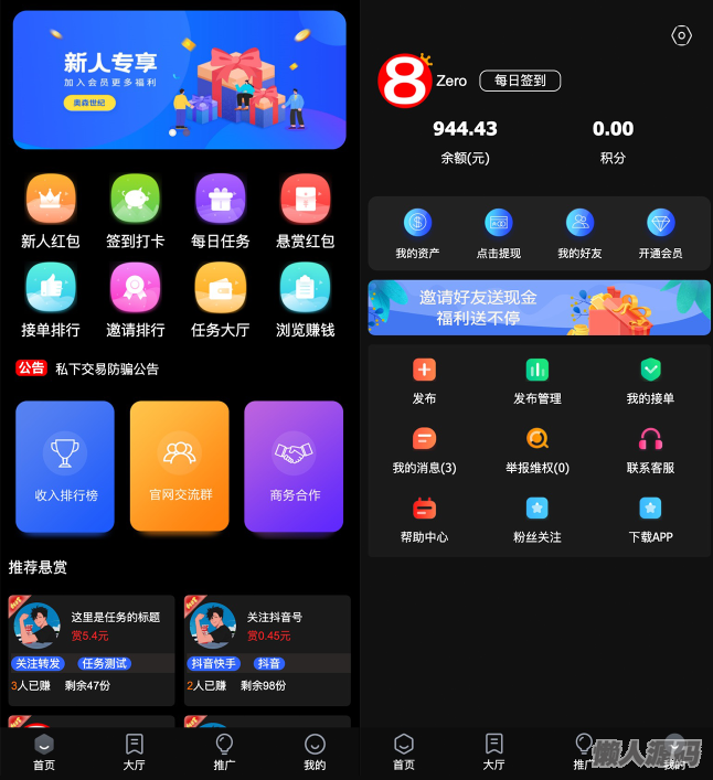刚的众人帮任务悬赏平台新UI版本,去除了注册接收(当然也可以加),对接了Z支付个人免签接口。运营版的好处就是,从任务发布到审核结算,推广链接分享,佣金绑定及计算,都是完整且合理的流程,直接搭建即可运营。可以打包APP,基本上网站的所有设置都在后台可直接修改。