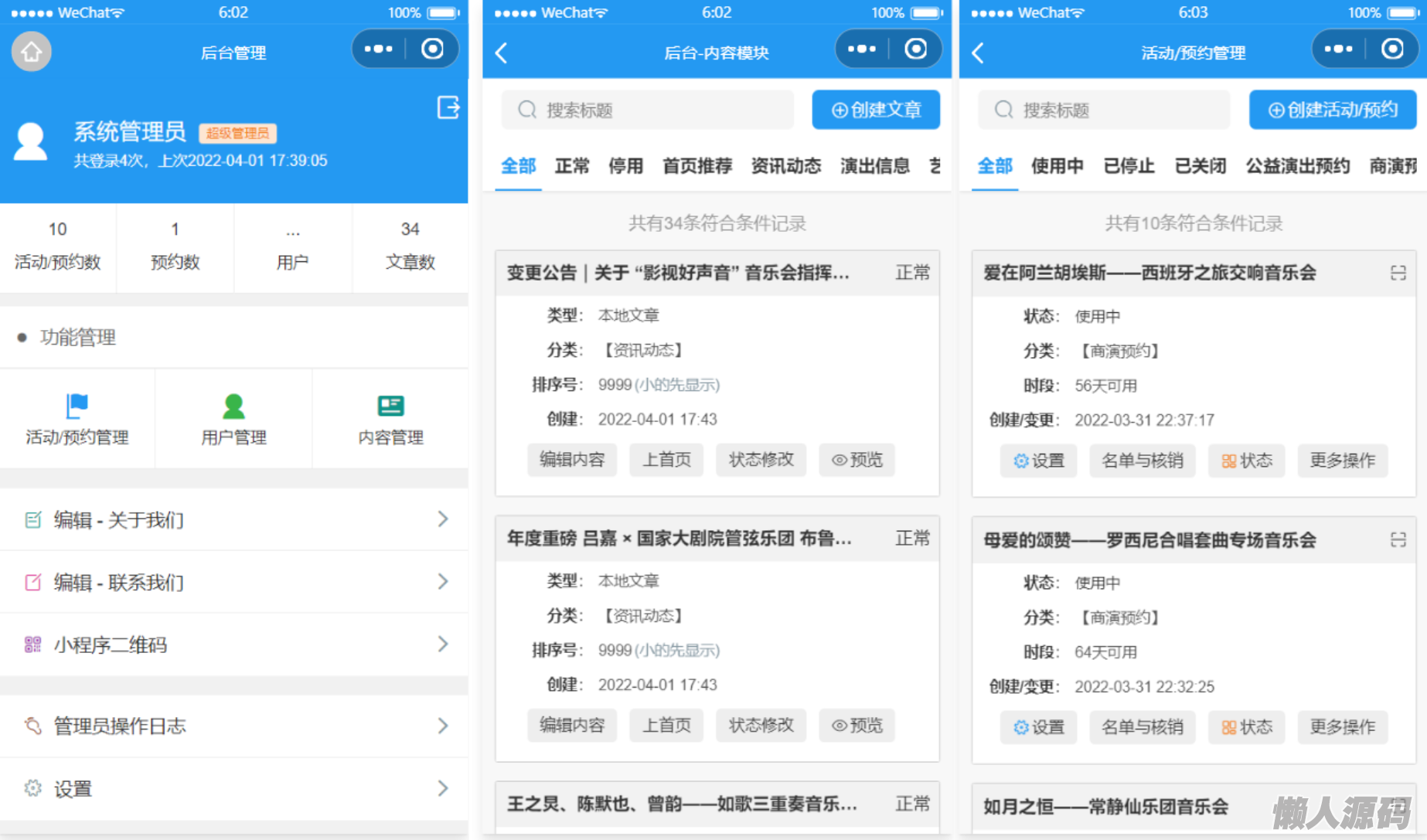 音乐厅小程序 ,包括资讯动态,演出信息,艺术教育,经典 剧目,商务合作,关于我们,公益演出预约,商业演出预约,演出日历,我的预约,我的预约码,后台预约管理,后台预约核销,后台CMS内容管理等功能模块。是一个数字化的艺术殿堂公共平台,无需安装,让您能够随时随地便捷地走近乐团、走近交响乐