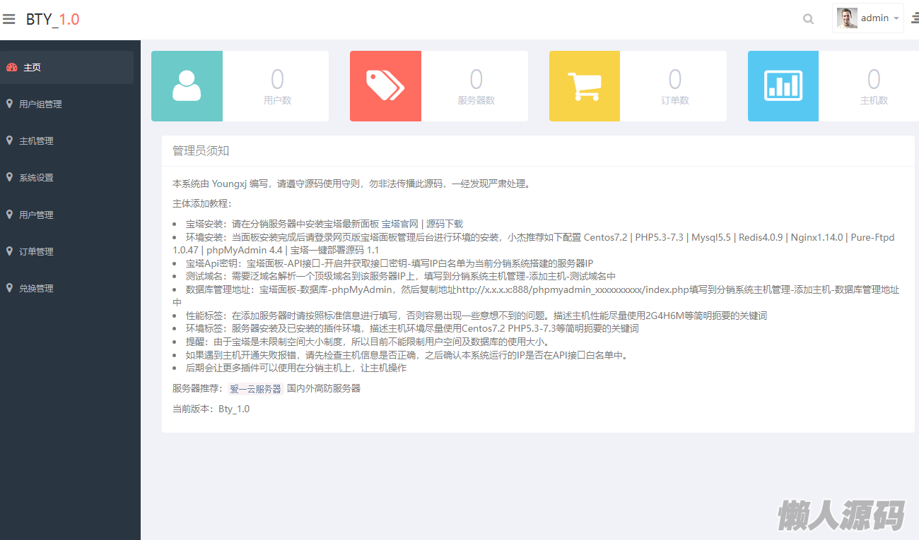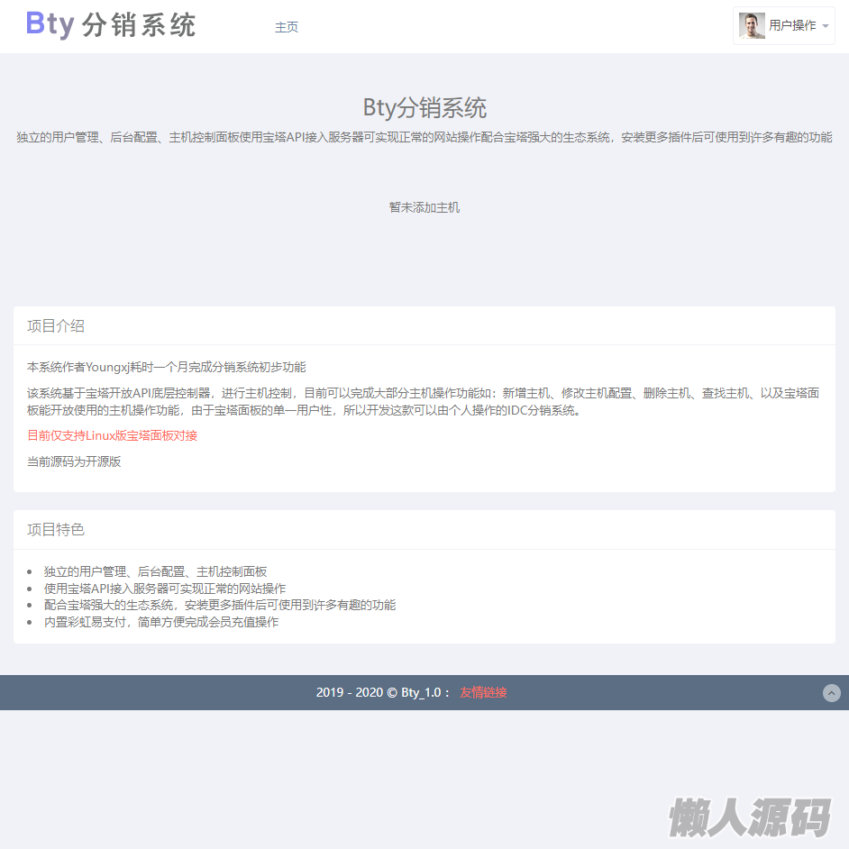 Bty分销系统开源版,宝塔分销系统开源版,该系统基于宝塔开放API底层控制器,进行主机控制,目前可以完成大部分主机操作功能如:新增主机、修改主机配置、主机、查找主机、以及宝塔面板能开放使用的主机操作功能,由于宝塔面板的单一用户性,所以开发这款可以由个人操作的IDC分销系统。