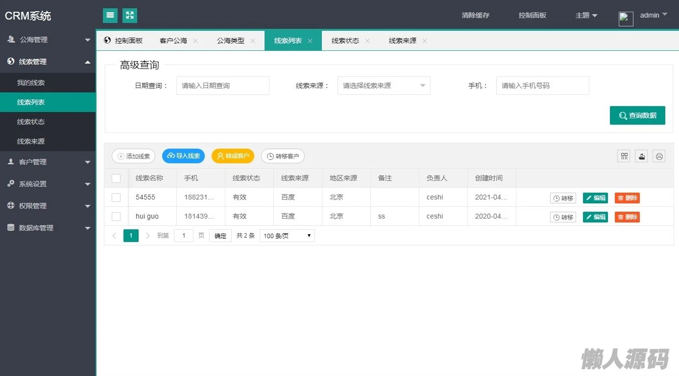 2、 线索管理:我的线索、线索列表、线索状态、线索来源。