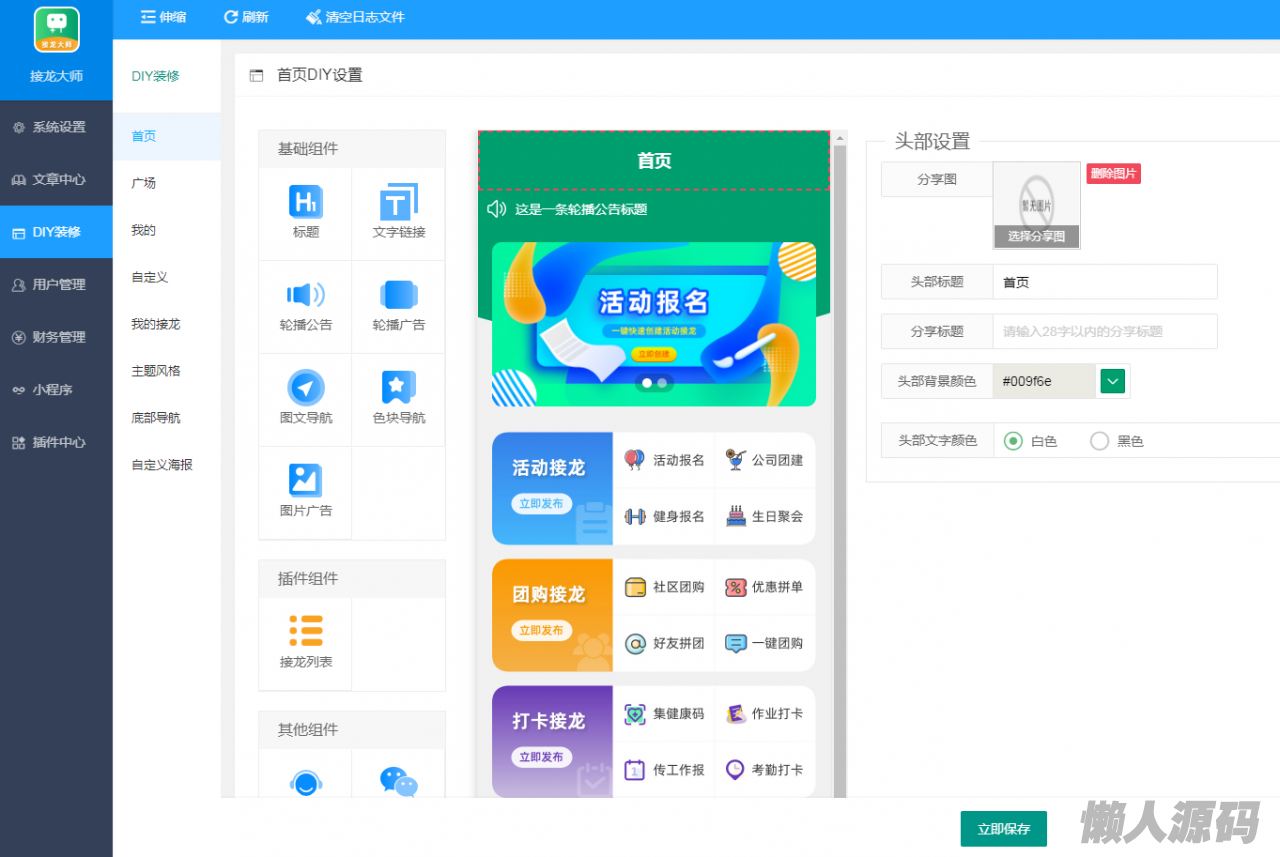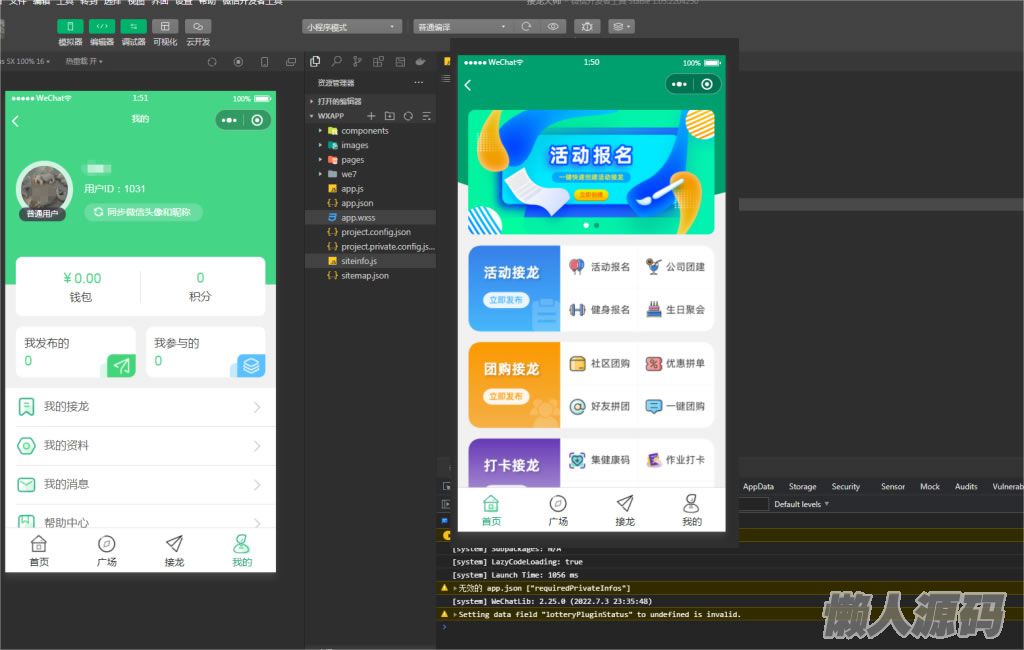 接龙是一个安全易用的信息收集小工具,为社群提供通知、打卡、填表、问卷、报名、预约、团购等一个超简单的接龙小工具。该系统为框架应用模块,只可惜插件只带4个并不全,不过使用活动接龙、打卡接龙没问题,小程序端整体界面设计还不错,像团购接龙因为没插件不能使用,用户也是老接口,上传时选低基础库不影响使用。