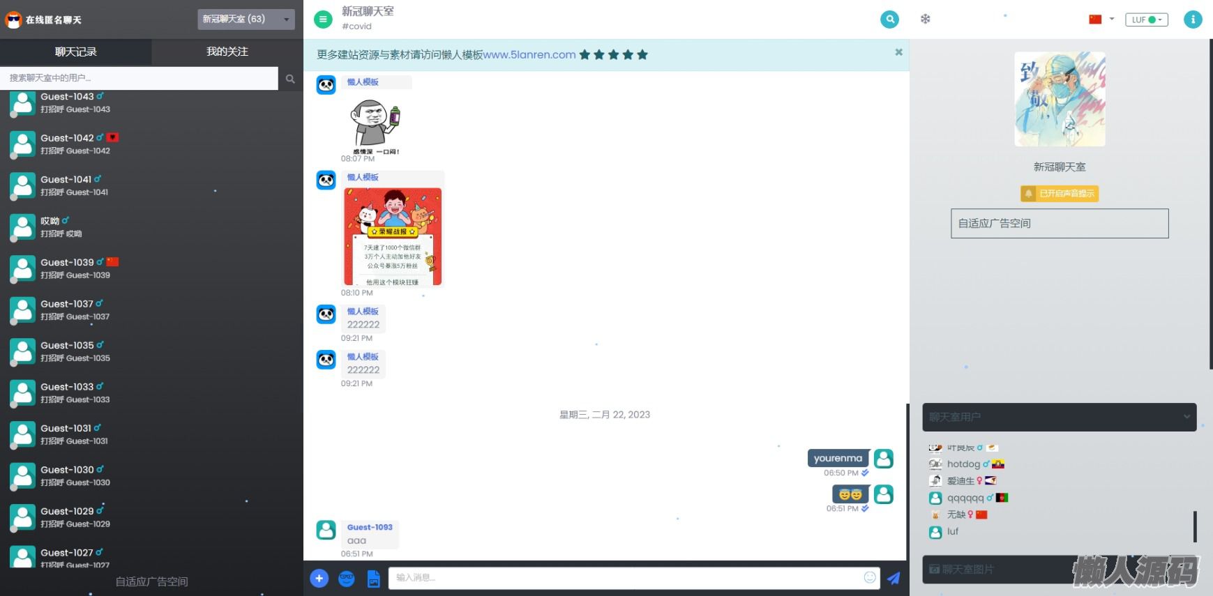 懒人源码 » 自适应匿名聊天室多语言网站源码完美可商用,可发图片音频聊天私人聊天整站源码