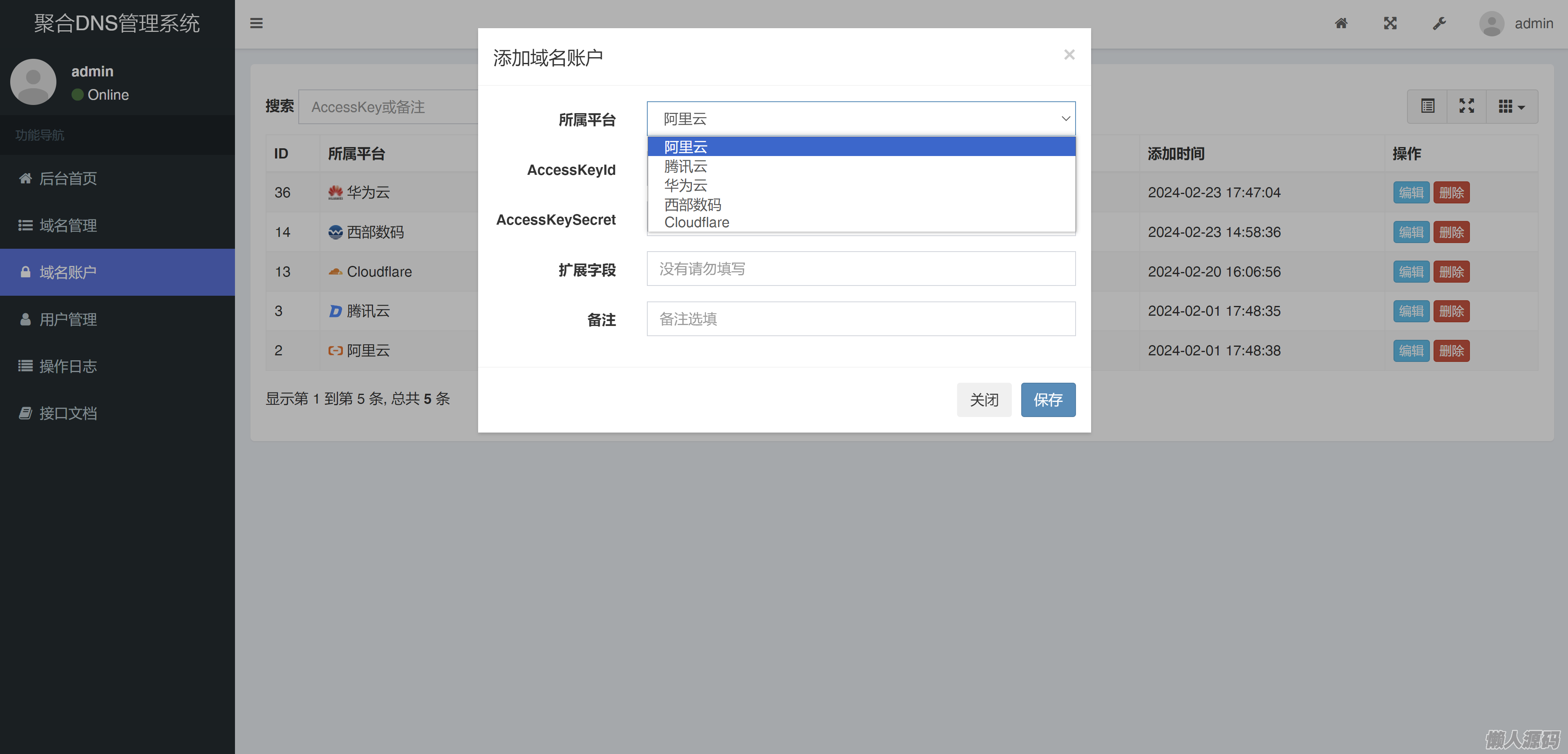 聚合DNS 管理系统 可以实现在一个网站内管理多个平台的域名解析,目前已支持的域名平台有: 阿里云 、云、华为云、西部数码、DNSLA、CloudFlare。
