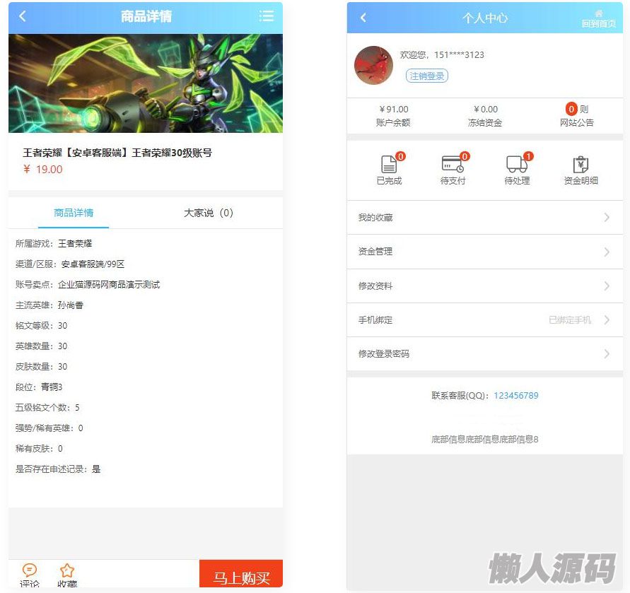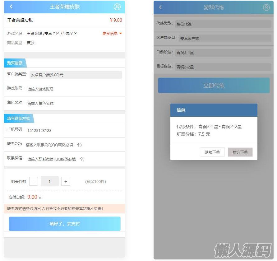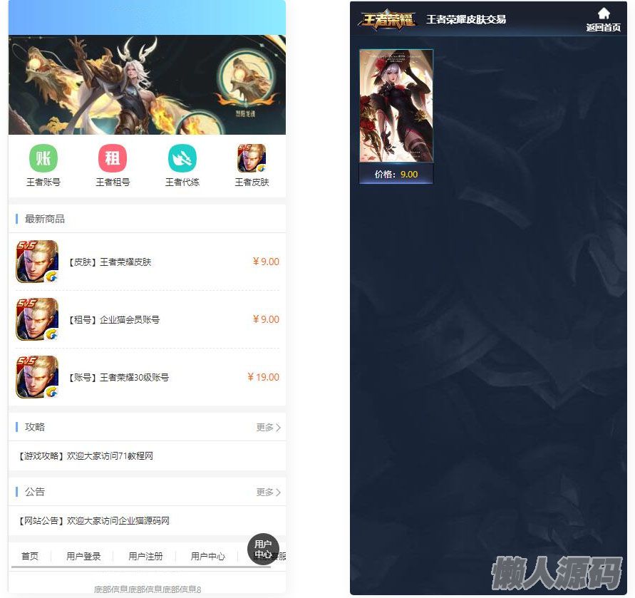 懒人源码 » 某站价值100的王者荣耀代练/账号交易/皮肤交易/系统源码