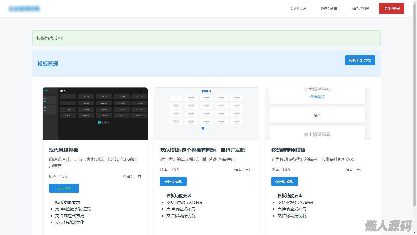 卡密管理和验证,多模板支持,响应式设计,保护,防刷机制,简洁的用户界面,