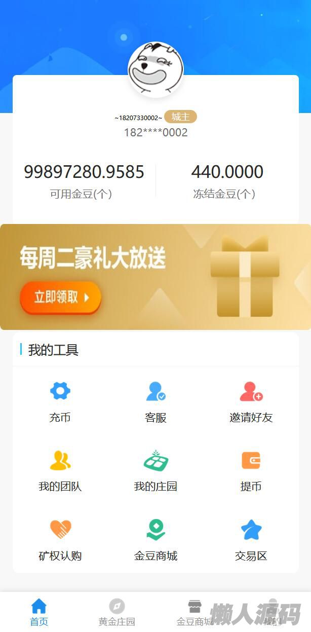 懒人源码 » 市价588元的区块链农场游戏【黄金庄园】种植挖矿复利分红投资/虚拟货币交易源码