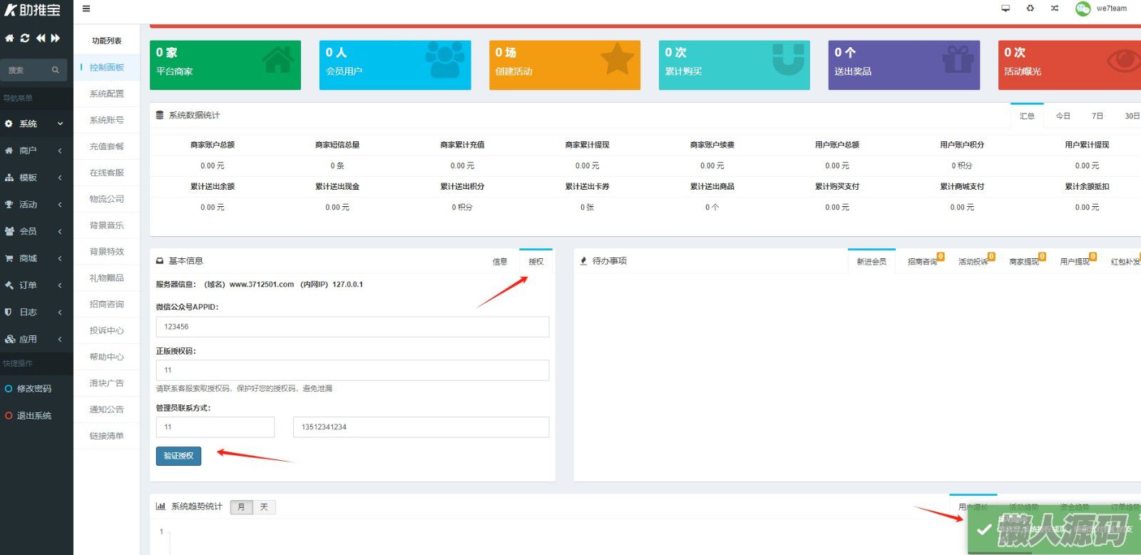 上传模块至addons目录解压,后台应用管理直接安装即可使用,本次修复了主程序安装会提示出错的问题,同时提供单独的商户登陆后台文件,该文件ztb.php放到WEB目录下,后台后先,随便填写,后系统账号才能正常使用。该系统玩法与助推客营销不一样,需要先创建商家,所有活动均由商家登陆PC端或者手机端后台自行选择模板创建。