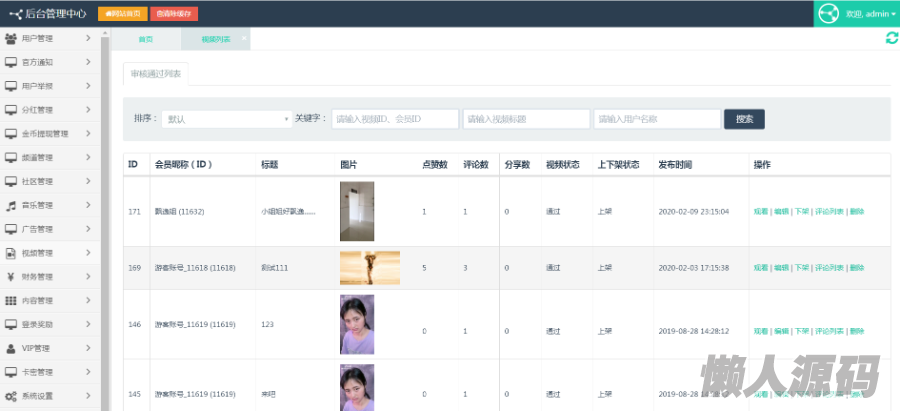 除了直播没有开通,其他功能都是,非会员不能评论,发布视频需要注册,功能模块很多,支付模式,,卡密,用户自己上传带赏金,点赞,关注,留言等功能。