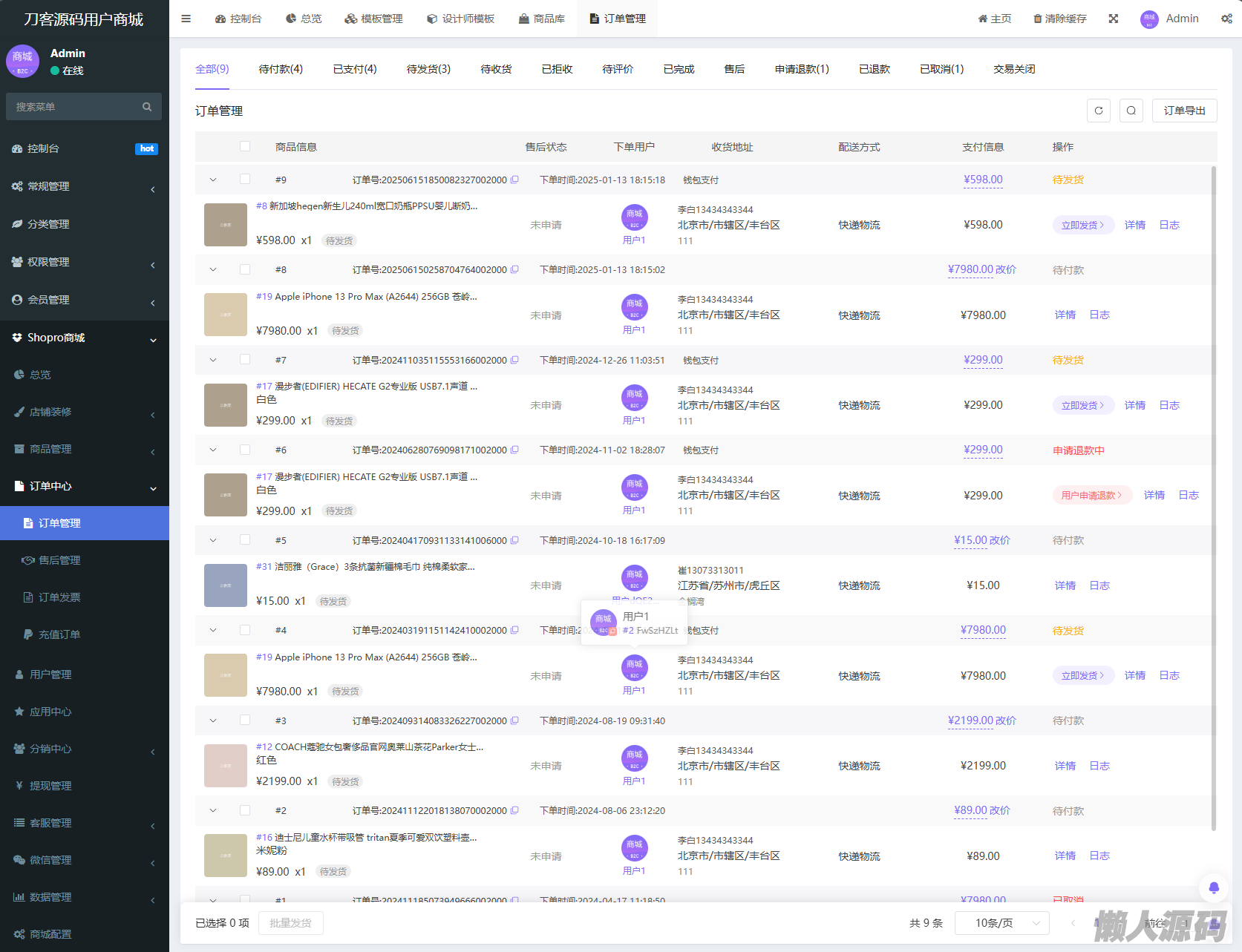 支持拼团,购物返积分,小程序直播,客服等等