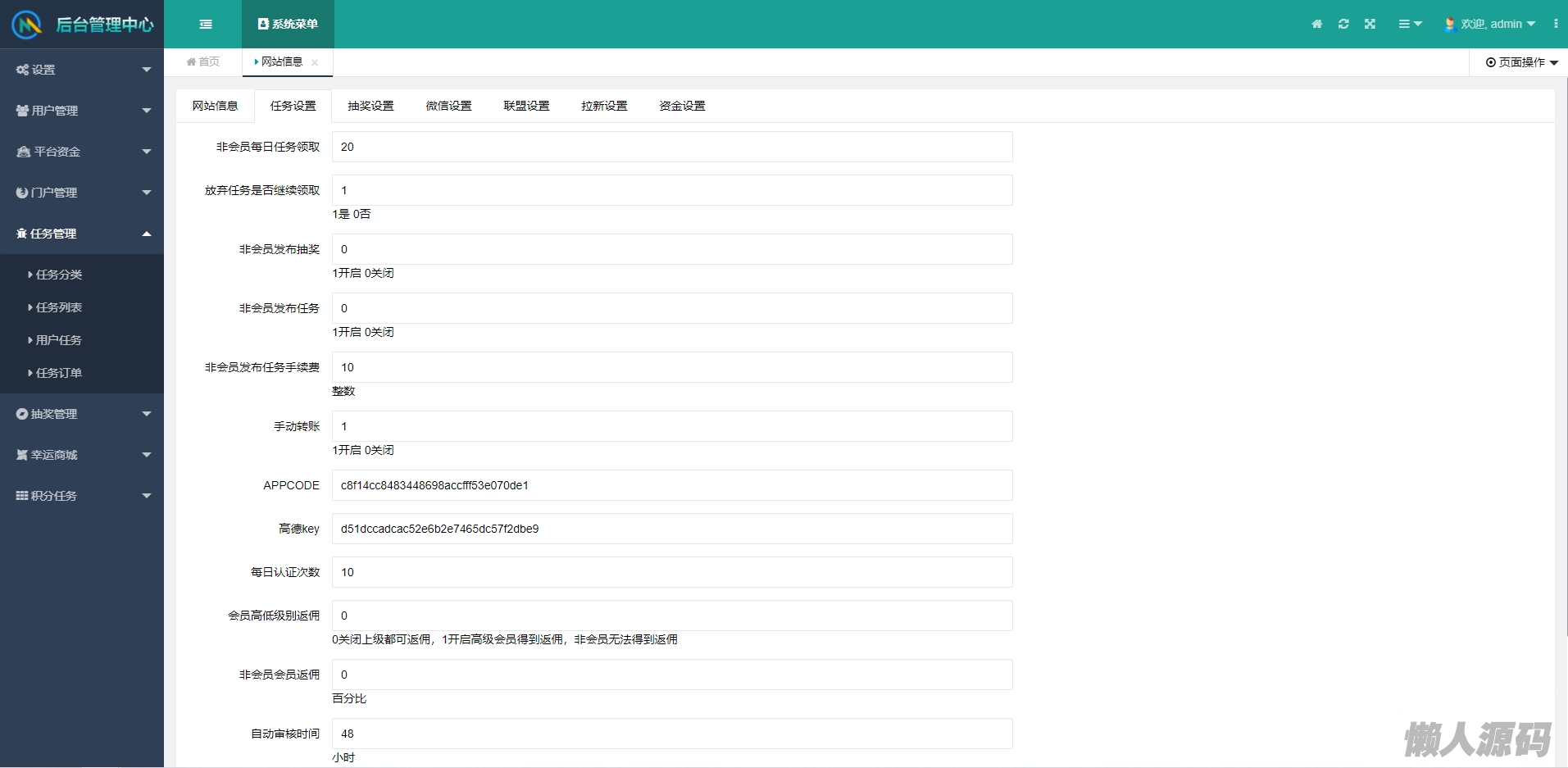 其他设置:包含低设置,低单个任务发布佣金设置、每日设置、任务信用分设置,完成不了任务信誉分降低等问题配置。