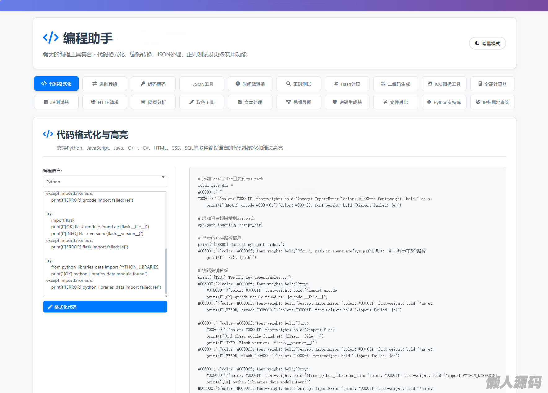 - **多语言代码格式化** - 支持Python、JavaScript、HTML、CSS等主流语言