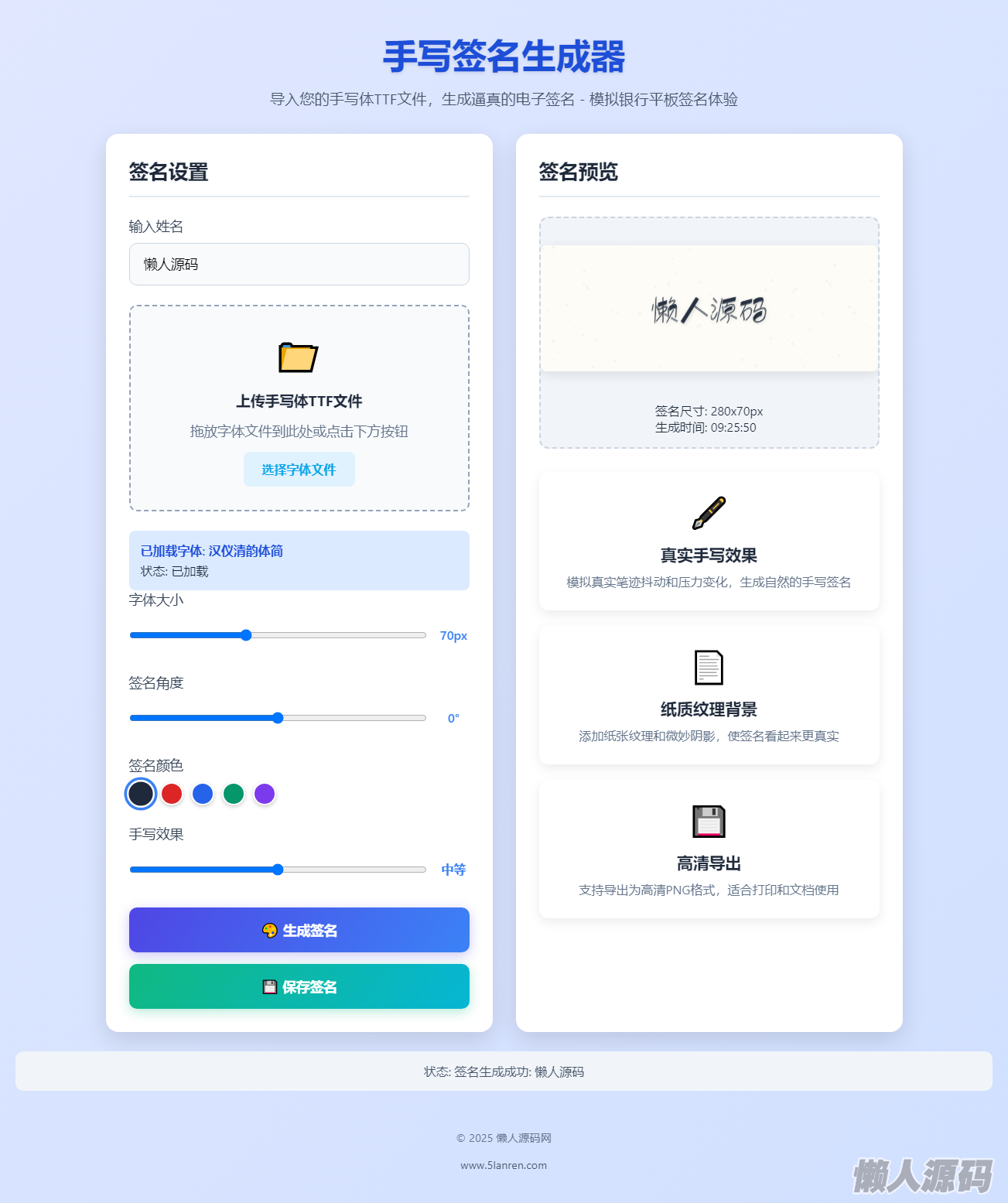 这是一款手写 签名 源码,导入您的手写体TTF文件,生成逼真的电子签名,这个单页源码是利用AI写的源码,简单测试了,可以导入TTF文件并且生成之后还可以签名图片。
