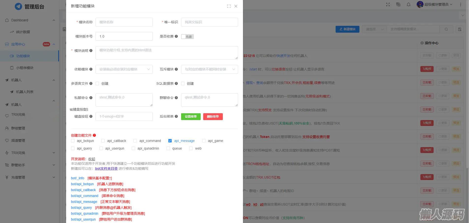 trx兑换 闪兑 关键字监控 群管 usdt监控 余额查询 推广分享 等几乎常见的TG机器人功能都有