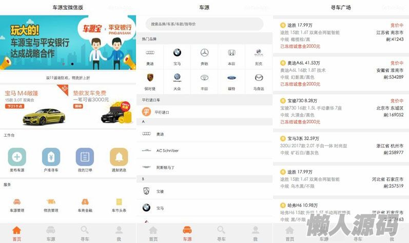 小程序源码仿《车源宝》在线汽车交易平台系统实现车源宝客户端部分功能,包括首页,车源,寻车,登录等页面。车源宝小程序前端源码