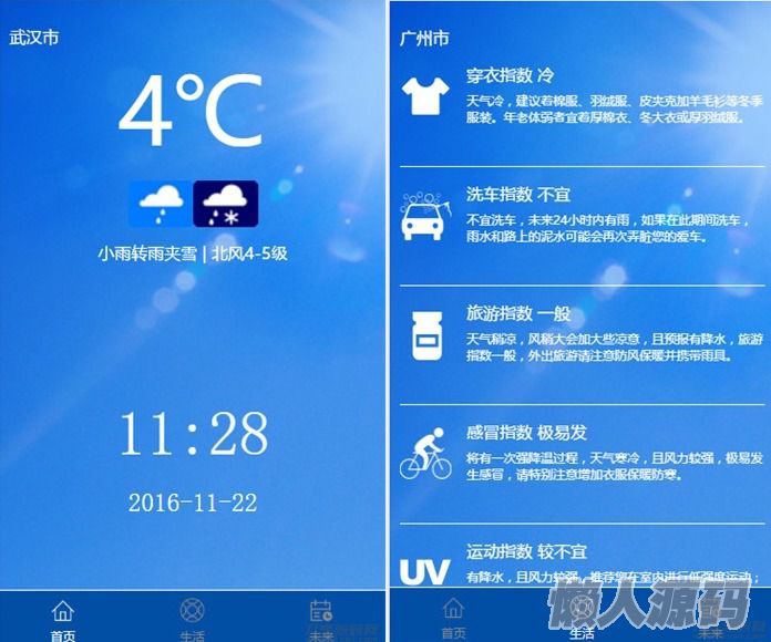 主要功能:实时天气、未来几天天气、穿衣出现建议等等。