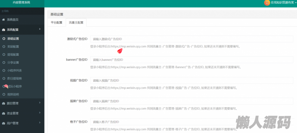 主要功能 答题有奖红包,可配合流量主推广,广告变现,后台含有区间余额区间奖励配置,自定义金额配置;